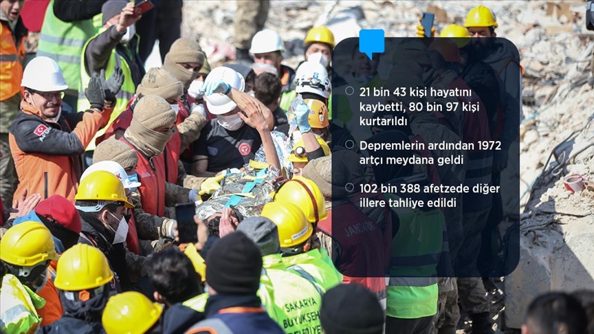 Kahramanmaraş, Gaziantep, Şanlıurfa, Diyarbakır, Adana, Adıyaman, Osmaniye, Hatay, Kilis, Malatya ve Elazığ'daki can kaybı 20 bin 937 oldu, 80 bin 88 kişi kurtarıldı. Depremden etkilenen illerden 102 bin 388 afetzede tahliye edildi.