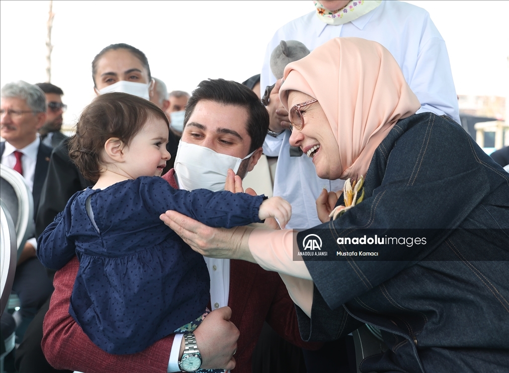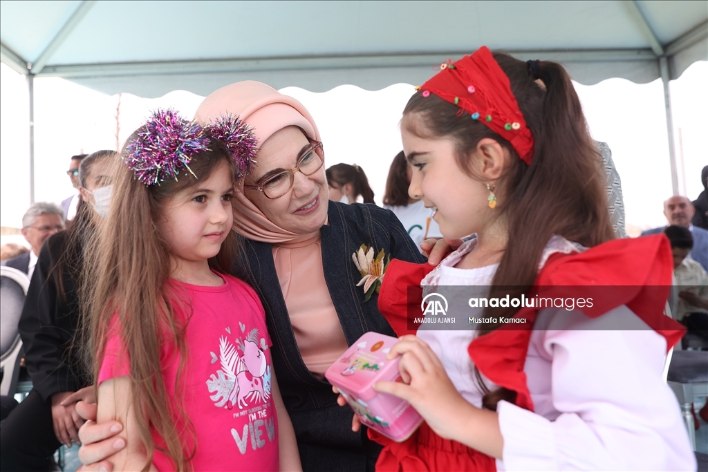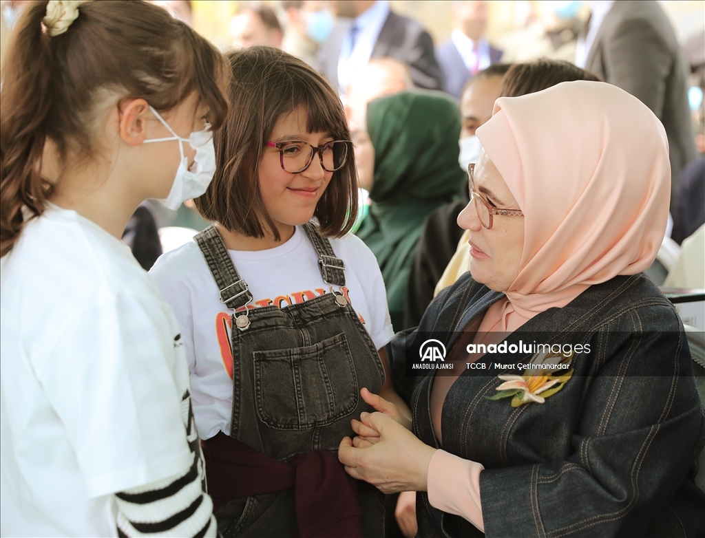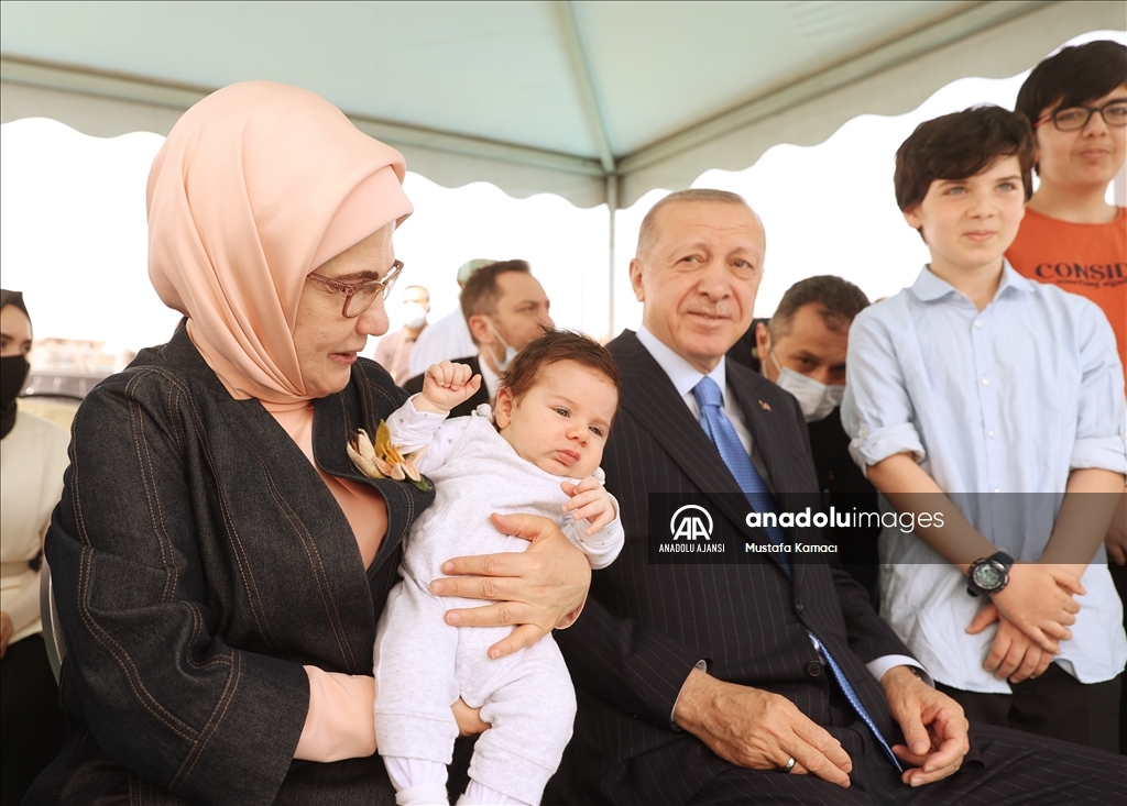 Erdoğan çifti daha sonra hediyeler verdikleri çocukların seslendirdiği "23 Nisan" şarkısına eşlik etti.