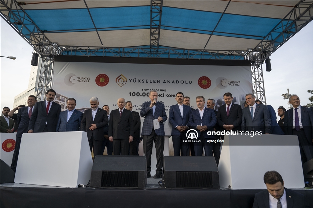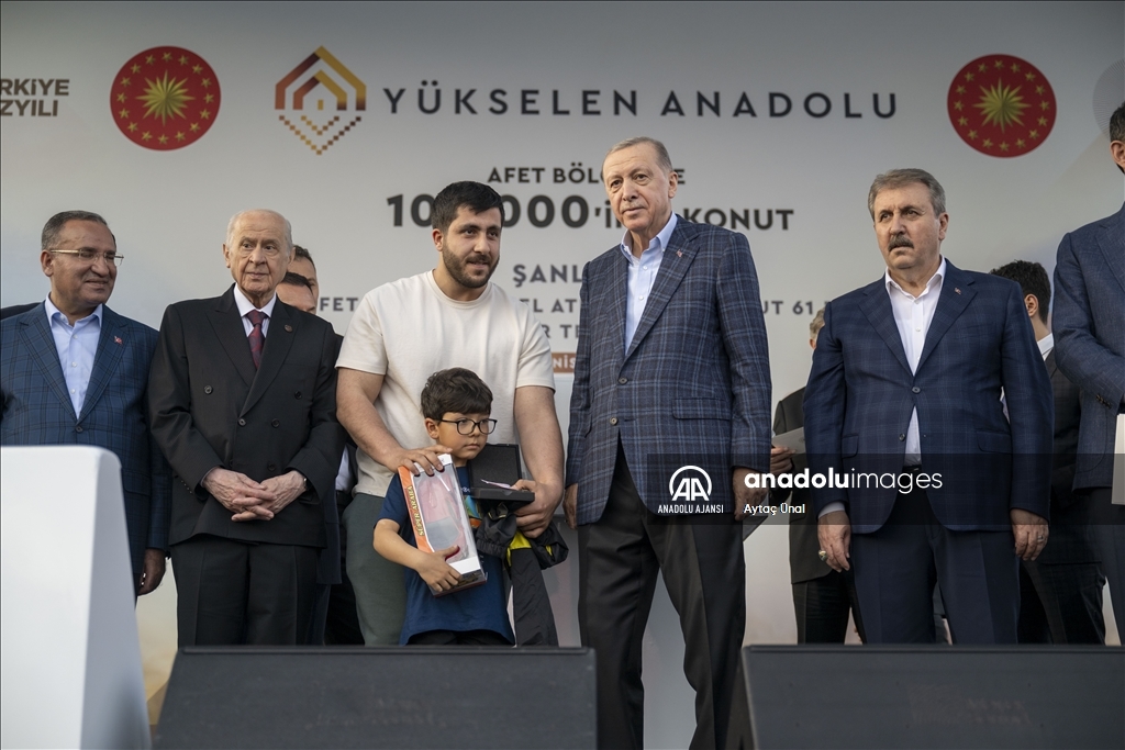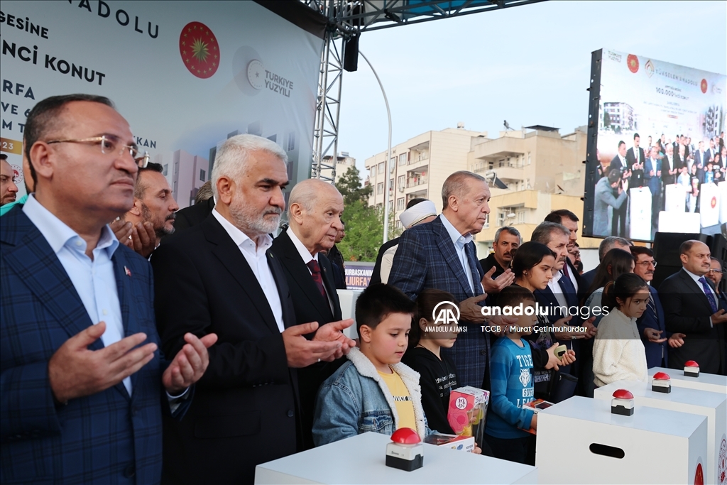 Deprem bölgesinde 100 binin üzerinde konut ve köy evinin inşaat sürecinin başladığını vurgulayan Erdoğan, "Hedefimiz ilk 1 yıl içinde 319 bin konut ve köy evini tamamlamak, toplam 650 bin konut yaparak tüm şehirlerimizi ayağa kaldırmak. Şanlıurfa'da da 11 bin konut ve köy evi inşa edeceğiz. Her birinizi yeni yuvalarınıza kavuşturuncaya kadar çalışacağız. Benim Urfalı kardeşlerim tamamen huzura erene dek, gönül huzuruyla işine, gücüne, hayatına dönene dek yanınızda olmayı sürdüreceğiz." dedi.
