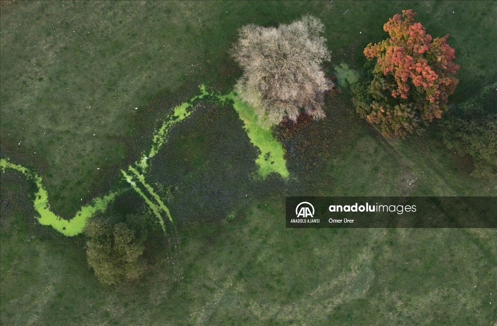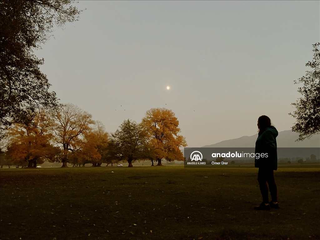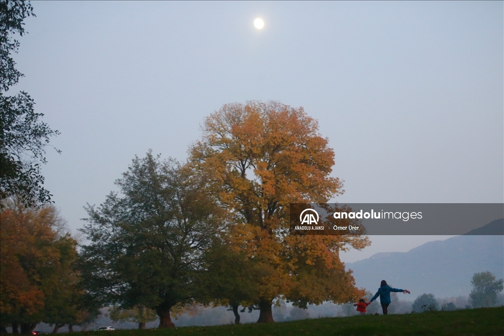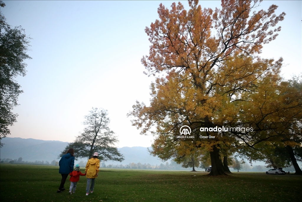 Düzce'de Efteni Gölü Ulusal Öneme Haiz Sulak Alanı içerisinde bulunan Gölyaka Kültür Park'a gelenler, sonbaharda yaprakları sararan ağaçlar arasında doğanın tadını çıkarıyor.